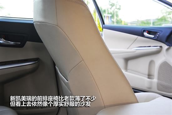 首先是前排座椅,如果您了解上一代凯美瑞,那么您一定对原来车上那个像真皮沙发一样厚重的前排座椅印象深刻,还记得当年我第一次坐凯美瑞的时候,就觉得地方大也不能这么祸害呀,太浪费了。而新车的前排座椅背面向前收缩了7cm,很高兴看到日本人找到了不破坏舒适性又能让椅子更薄的方法。