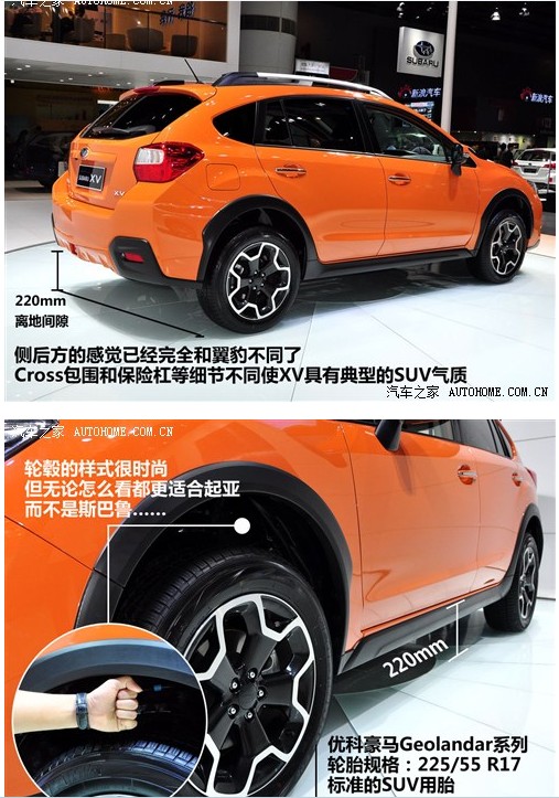 斯巴鲁XV定位于一款跨界车型,外观看上去很时尚。但是斯巴鲁XV 220mm的离地间隙很明显已经超过了大部分城市SUV,同时225/55 R17的优科豪马轮胎采用是Geolandar系列的,这不折不扣的SUV用胎。