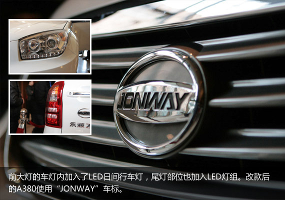 从外观我们可以看出,车辆的大灯、尾灯、高位刹车灯都装饰了LED灯,车顶还设计了CROSS风格的行李架。新车采用了JONWAY的新标示。