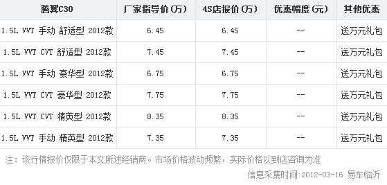 近日小编从临沂长城顺通4S店处了解到,目前购买长城腾翼C30送万元大礼包。具体降价明细如下表: