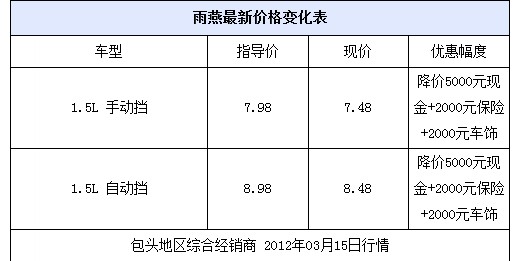编辑从包头利丰长安铃木4S店获悉,目前该店铃木雨燕现车充足,购车享5000元现金优惠+2000元保险+2000元车饰,具体优惠请到店细谈。以下为最新价格表:
