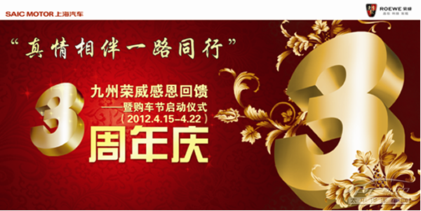 值此临沂九州荣威4S店开业3周年之际,为感谢社会各界一直以来对我店的支持与厚爱,九州荣威特别推出感恩回馈优惠活动,4.15日莅临九州顺达荣威展厅参与庆生party,欣赏歌曲,品味美食,拿惊喜大奖!