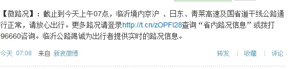 临沂市公路局工作人员介绍,微博,以其开放性、便捷性、及时性的特点,目前已成为公众最为关注的信息共享、传播及获取平台之一。为方便公众出行,除通过96660公路服务电话及短信、网站、电台、电子情报板等平台向公众提供路况信息外,又开通了官方微博。