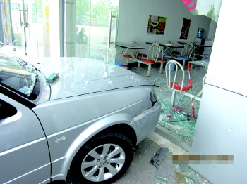 市民尚先生告诉记者,10日9时许,他正在临沂汽车北站附近,突然听到一声巨响,向周围一看,原来是一辆捷达车拱进了路边一间小吃店,店面的一扇玻璃门被撞碎。由于当时店面还没营业,里面没人受伤。