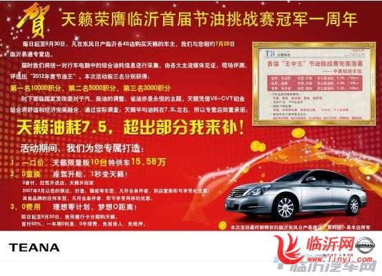 即日起至6月30日,凡在东风日产临沂各4S店购买天籁的车主,我们与您相约7月29日临沂易通专营店。届时我们将同一对行车电脑中的综合油耗信息进行采集,由各大主流媒体见证,现场评测,评选出“2012年度节油王”。