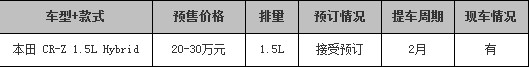 日前,搜狐汽车编辑从临沂地区广汽本田经销商,临沂冠成4S店了解到,目前,本田汽车纯进口有点混合动力轿跑车CR-Z展车已经到店,到店型号为1.5L Hybrid。现已接受预订,订金1万元,提车周期为2个月。因厂商尚未公布改款车型在国内的售价,因此,具体价格需咨询经销商。