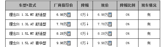 2012款理念S1除了1.5L手动车型以外,其他三款车型售价与2011款车型并无差异。新增1.5L手动车型搭载的发动机最大输出功率1.5马力,匹配了5速手动变速器。2012款理念S1在配置上将会有小调整,为了进一步增强了商品性,提升美观度和舒适度,2012款理念S1在雨刮、音响、轮榖等实用性、美观性配置方面进行了改良,更加符合中国消费者的使用需求。
