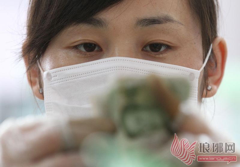 点钞员戴着口罩,一丝不苟地在工作。