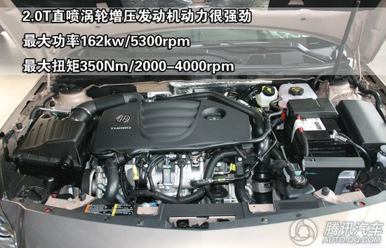 动力方面,君威搭载的主力车型应该是其2.0T直喷涡轮增压发动机,这款发动机采用了双流道技术以及DVVT可变气门正时技术,其最大功率为162kW(220Ps)/5300rpm,最大扭矩为350Nm/2000-4000rpm,从数值来看,这款2.0T发动机与致胜的那款相比最大功率稍低一些,不过最大扭矩却要多处10Nm,估计在实际驾驶时这两款车加速的差距也是微乎其微,毕竟两款车的自重也都相差不大,而且从之前我们的测试成绩来看,君威的这款2.0T车型的加速时间为7.5s左右。