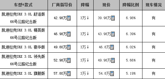 目前,店内有SRX现车。现在购买这款车型可享受3万元现金优惠。另,店内有试驾车可供试驾,感兴趣的朋友不妨到店赏车试驾后,作购车定夺。