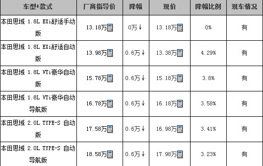 现在购买思域舒适手动版无优惠,其它车型可享6000元现金优惠。全部车型均可赠送挡泥板、原厂脚垫等精美礼品。现车方面:目前店内现车充足、颜色齐全。店内有试驾车,欢迎感兴趣的朋友到店赏车试驾。