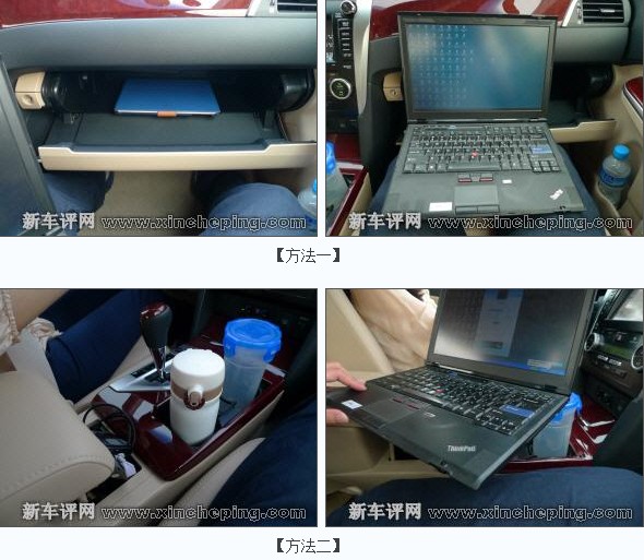 方法一是放下手套箱盖子,将电脑搁在手套箱盖边缘和膝盖上。方法二更巧妙,当时前排的杯座上放了两个高身的杯子,正好与宽大的手枕差不多等高。我把电脑的一边搁到手枕上,另一边正好架在杯子上,这样就成了一个很好的临时工作台,坐姿、位置都相当顺手,我就这样写了一个多小时的稿子,一点都不觉得别扭。