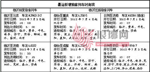 据悉,2012年暑期运输期限自7月1日起至8月31日止,为应对暑期旅游流和学生客流大量涌现带来的客运压力,经我市地方铁路局、临沂车务段等部门积极申请,自7月1日起,我市将新增旅客列车6列。其中,新增始发旅客列车2列,分别是临沂至北京,临沂至济南;过路旅客列车4列,分别是烟台至重庆、烟台至成都、日照至济南、日照至西安。此外,青岛经我市至扬州的旅客列车也将延伸至南京。