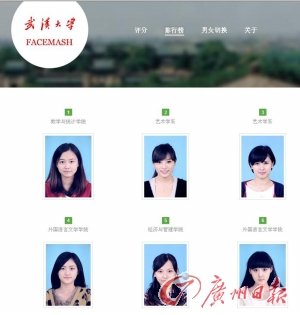 (记者杜安娜 实习生冯军福、张晨子)昨日,关于“武大校花校草帅气大PK”的帖子在网上蹿红,引来众多网友围观。随后,记者登录这个名为“武汉大学Facemash”的网站。网页上显示两名武大学生的证件照及学院,每刷新一次页面,便会出现不同的“选手”。不仅如此,网友还可通过照片下方的选项,对两名学生的相貌“指指点点”,并进行评分投票,而票数多的同学将登上网站的排行榜。排行榜分男、女两个版本,分别设有18个名额,依票数排列。有网友戏称,这简直就是校园里的一场“选美”。