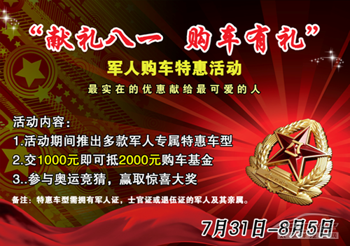 活动期间九州顺达推出多款特惠车型,更有多种分期方案,让您轻松坐享有车生活,另外,凡持军官证、士兵证、警官证、退伍证,交1000元抵2000元使用,还可参与奥运竞猜,赢取惊喜大奖!(军人家属出示相关证件亦可享受上述优惠)