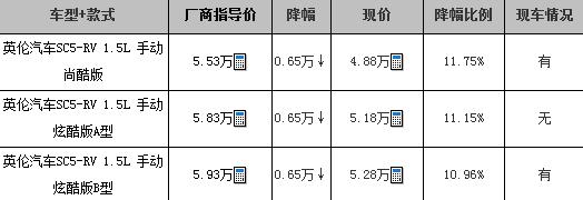 日前,汽车编辑从临沂地区英伦汽车某经销商了解到,目前店内SC5-RV部分现车销售,购车优惠6500元。车的颜色主要是蓝色、红色、白色等。可以预订,订金5000元,提车需等待约2-3周。关注该车的网友不妨到店与销售商面谈,争取更大的优惠。