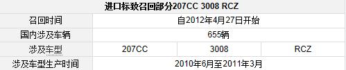 近日,标致雪铁龙(中国)汽车贸易有限公司向国家质检总局递交了召回报告,因发动机缺陷,将自2012年4月27日起,召回部分进口2010-2011年款标致207CC、3008、RCZ汽车。据该公司统计,在中国大陆地区共涉及655辆,生产日期为2010年6月至2011年3月。