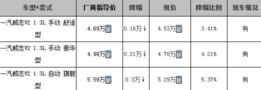 近日,汽车临沂站编辑从天津一汽临沂汽车市场某4S店了解到,近期购买威志V2车型现金优惠最高达3000元,另送地板革、坐垫等价值2000元的礼包。店内现车较为充足,颜色齐全。可以预订,订金2000元,提车需等待1周。喜欢该车的网友可到店详细咨询销售商。