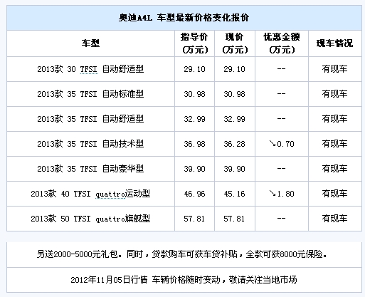 近日,小编从临沂奥丰奥迪城市展厅了解到,奥迪A4L目前部分车型有现车,目前购车可最高优惠现金1.8万元不等,另送2000-5000元礼包。同时,贷款购车可获车贷补贴,全款可获8000元保险。另外,汽车之家奥迪全系团购活动正在招募中,团购可获更大幅度优惠: