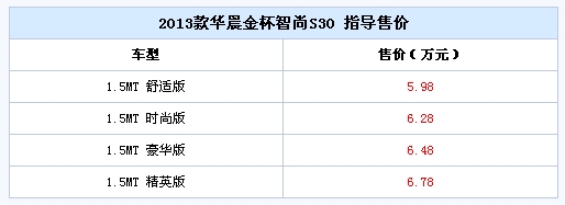 华晨官方透漏,2013款华晨金杯智尚S30正式上市。本次共有4款新车上市,搭载1.5升发动机,售价区间为5.98万-6.78万元,详见下表: