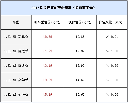 日前,我们从经销商处获悉,2013款景程已经到店,同时相比老款,售价有所调整。新车价格区间为10.89万-15.19万元。(注:此价格为经销商提供,最终售价请以官方发布为准)