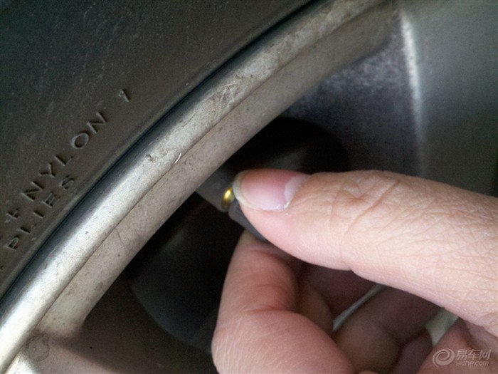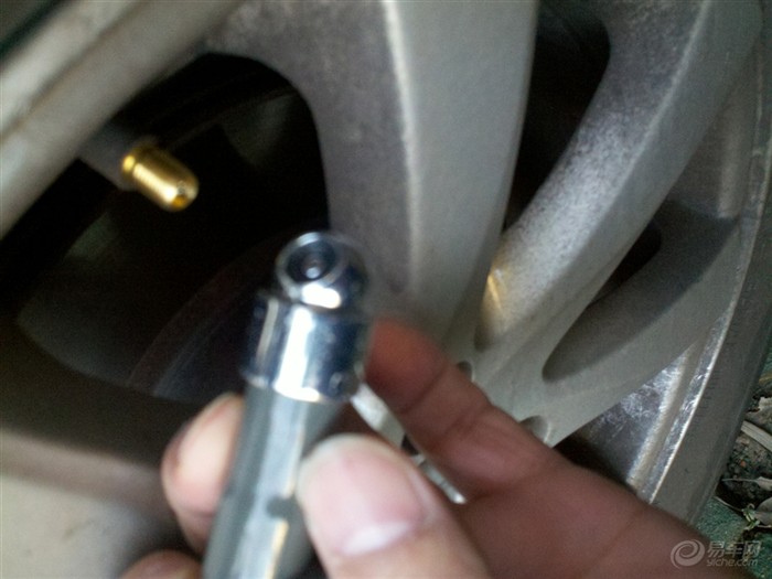 找出胎压计的口子将它成90度垂直的压上去,确保一定要压好,别出现跑气的声音。