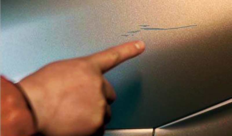 如果刮到车身的钢板上面,擦伤比较严重,能看到下层底漆的颜色,那就要到维修厂补漆了。因为即使是一个很小的破损,钢板也会开始生锈,到那时候即使补漆效果也不理想了。为了尽可能不出现色差,哪怕只是不大的一块需要补漆,维修厂也会把整块全部重新喷。