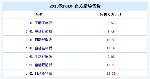 【临沂网汽车】日前,我们从官方获悉,上海大众2013款POLO已经正式上市,新车针对内饰和外观细节进行了一些修改,车身颜色新增了风潮绿色,售价方面与老款相同,为8.59-12.39万元,详细售价请见下表: