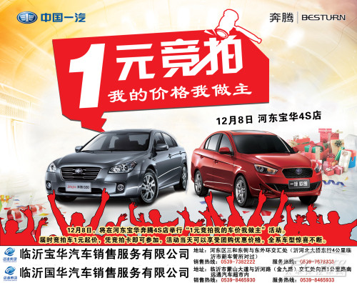 12月8日将在临沂宝华奔腾4S店举行“1元竞拍我的车价我做主”活动。届时奔腾B50竞拍车1元起价,凭竞拍卡即可参加,竞拍活动当天所有订车客户都可享受团购优惠价格,购车客户均可免费参与现场抽奖,全系车型惊喜不断。