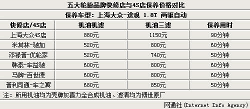 为进一步体验一站式服务快修店的服务质量和保养成本,网通社访了位于北京市内的一家米其林驰加店,并在该店对途观1.8T车型进行了机油和机滤的更换,其中机油为壳牌4L的灰喜力全合成机油,机滤为博世的产品,共计520元,此外驰加店也并未收取任何工时费,并附带免费进行31项安全项目检测,共计用时60分钟。随后网通社还用另一辆途观1.8T开往北京市内的上海大众4S进行小保养,添加同样为灰喜力的4L机油以及同为博世的机油滤清器,收取工时费后共计900元,加之进行了全车检测,共计用时90分钟。