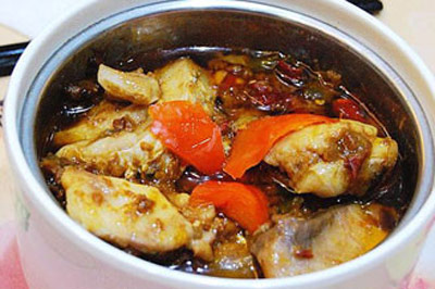 1.青鱼洗净沥干片成约1厘米左右的片状,加入很少的盐抹匀并腌制约20分钟;准备好一份秘制酱料(蚕豆辣酱+葱姜蒜),加入10克左右原汁鸡汤调和一下; 2.把制作好的酱料加入腌制好的鱼片中,用筷子把鱼片和酱料拌匀,使每块鱼片都能蘸上酱料;切几块红椒片放在面上点缀一下; 3.水开上汽后放入蒸锅蒸上20分钟即可。