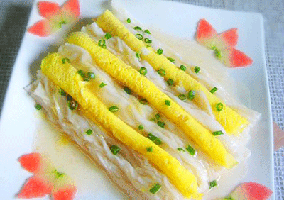 22.  蛋皮摆在肠粉上,淋上勾好的芡,撒上香葱,再用家里有的果蔬点缀即可。我用的是西瓜。
