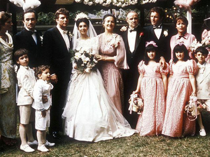 《教父(TheGodfather)》。在电影的经典家族聚会中,才适合穿着这么一套引人注目的新娘婚纱,Connie Corleone(TaliaShire饰演)的华丽礼服,如她的家族一样复杂强大。