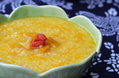 3.清水放入砂锅中烧开后,放入小米和南瓜丁,大火煮开后改小火慢慢熬一个小时。