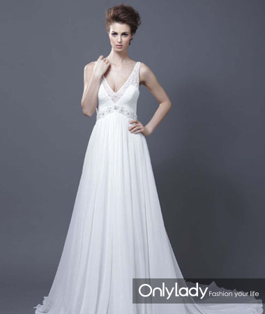希望婚礼上显得苗条一些就要尽量选择简洁化直线条裁剪的婚纱和礼服,修身的款式会看起来更苗条;腰部及裙摆的设计都应尽量避免繁复,以简单为宜;可选择下摆略蓬松的公主样式,但不宜过大,过大的裙摆会膨张下半身;V字低领的款式可露出性感锁骨并有显脸小的作用。