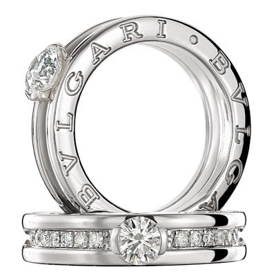 中央为一枚圆形明亮切割钻石(规格为0.3克拉与0.5克拉),戒指带有独特的双BVLGARI标识,是独创新颖、独具现代感的订婚戒指。