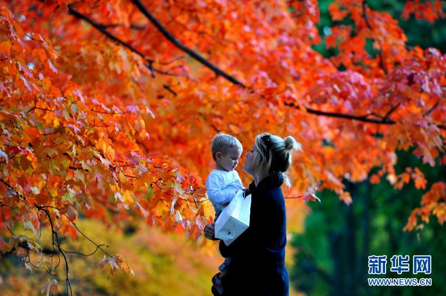 一叶落知天下秋。从枝头那一片落叶开始,秋天就这样走进了我们的视线。2013年10月22日,一名母亲带着孩子在纽约中央公园游玩。 新华社记者王雷摄
