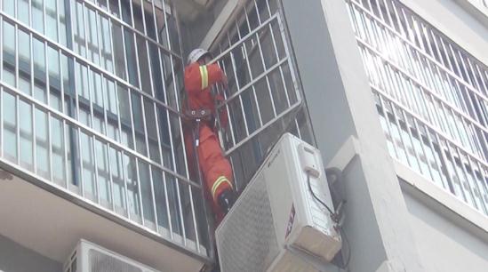 消防官兵赶到现场,并对周围的情况进行了观察。出事的单元楼整栋楼均安装了防盗网。李先生告诉消防官兵,防盗窗有个小门带着锁,可以直接爬进屋里。初步制定救援方案后,一名消防官兵爬到窗子处,站在空调外机上,对窗户进行破拆。