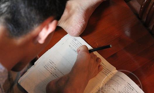 今年20岁的彭超,是攀枝花市七中的一名高三学生。6岁时,因触电失去双臂,他开始练习以脚当手,克服了常人难以想象的种种困难,学会了用脚写字、穿衣、吃饭、上网。去年,彭超参加高考,用脚答题,考出了538分的成绩,但遗憾的是,因为用脚写字,答题速度受到影响,他与理想中的大学失之交臂,之后,选择了复读。今年彭超是第二次参考,也是今年四川首批特殊考生照顾政策的受益者之一,获得了45分钟的语文延时,按时写完了答卷。改变命运的不仅仅是一次高考,还有更精彩人生答卷等着他用脚书写!