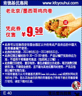 肯德基优惠券(当季优惠券):老北京或墨西哥鸡肉卷 优惠价9.5元