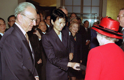 结婚初期,邓文迪收敛锋芒,退居幕后,除了一些重大活动,极少在公众场合露面。图为1999年,英国女王伊丽莎白二世10月19日晚在白金汉宫举行盛大国宴,欢迎中国国家主席江泽民对英国进行国事访问。默多克夫妇出席。