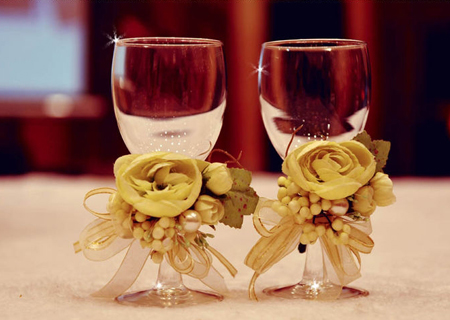 婚宴形式:西式自助餐和鸡尾酒会相结合,由侍者手托各种餐点及饮料在宾客间穿梭