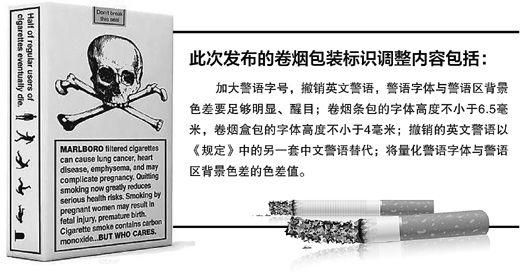 此次发布的卷烟包装标识调整内容包括:加大警语字号,撤销英文警语,警语字体与警语区背景色差要足够明显、醒目。卷烟条包的字体高度不小于6.5毫米,卷烟盒包的字体高度不小于4毫米;撤销的英文警语以《规定》中的另一套中文警语替代;将量化警语字体与警语区背景色差的色差值,具体指标和检测方法另行通知。