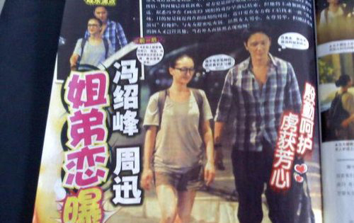 近日,名为“张min儿”的网友在微博中上传了一张照片,照片为某杂志的截屏。从照片内容中可以清晰的看出,该杂志称“周迅与冯绍峰的姐弟恋情曝光”,并配有身着休闲装的两人一同外出的图片。或许是由于拍摄的角度的问题,两人的手即将碰到一起。对于所谓的两人的恋情,该杂志描述称“殷勤呵护,虏获芳心”。