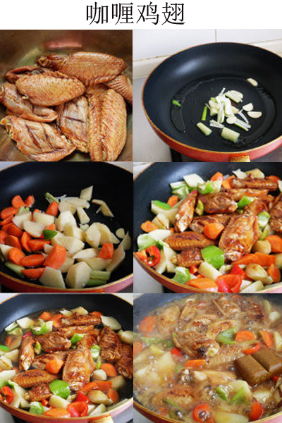材料:鸡翅、土豆、青椒、红椒、胡萝卜、油、盐、葱、姜、蒜、老抽、咖喱