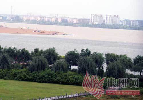9月17日,沂河城区段上游,琅琊八景中“沂水拖蓝”景观又一次显现,一条清晰的“蓝带”将滚滚而下的洪水分开。