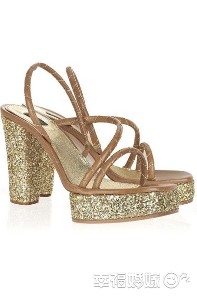 金色的高跟鞋,鞋跟部分的闪亮洒金设计和鞋面圆绳系带设计看起来很随性,准备参加户外婚礼的伴娘不妨尝试。