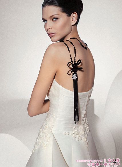 14、 脸部和颈肩是视觉效果的重点,选择结婚照的服装时,荷叶领、开襟 式的领口露出女性性感的锁骨,也极合适。而且,U形公主领的衣服也有使脖颈与脸蛋间看起来更加修长的效果。领口、胸前有蝴蝶领结的衬衫 ,如此也有拉长、修饰脸型的好效果。