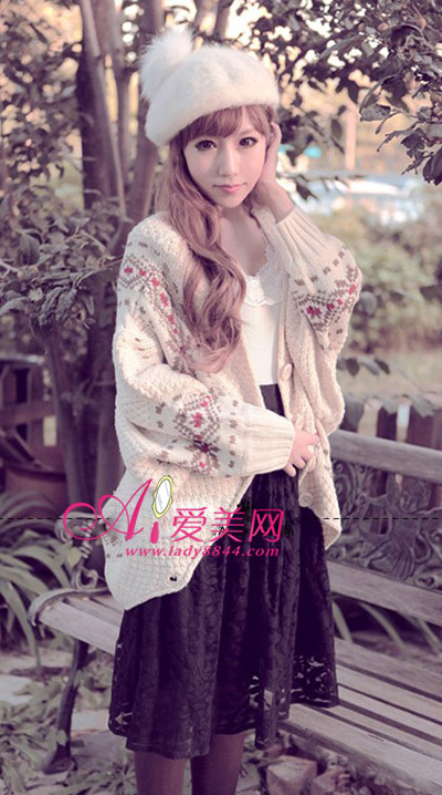 黑色蕾丝短裙妩媚不失浪漫气息,搭配印花毛衣外套,加上白色毛绒帽点缀,带着浓浓的冬日气息。