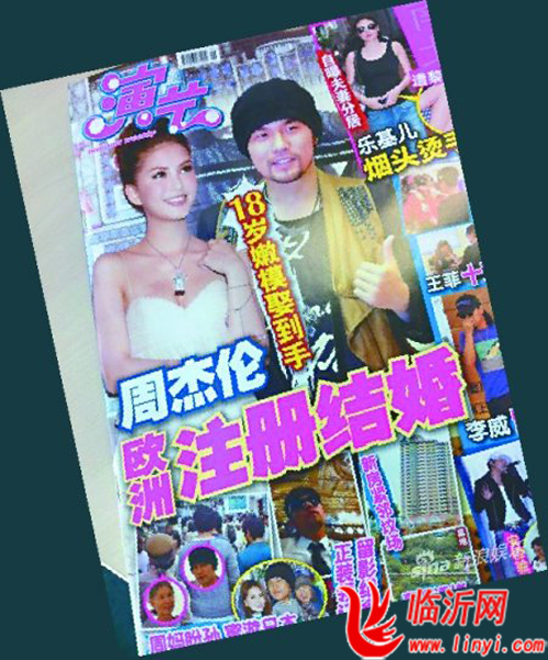 周杰伦结婚了?昨日,一条微博在网上迅速流传开来,上面附有一张翻拍的《演艺周刊》图片,上面称周杰伦与18岁的嫩模女友昆凌在欧洲旅游的过程中,于当地低调注册结婚。该报道称昆凌深得周母的疼爱,而此前杰伦在音乐会上试探问歌迷能否接受自己结婚。在图片中,昆凌身穿白色婚纱笑容满面,周杰伦则带着墨镜身穿正装,报道称这是周杰伦领证当天的穿着:“为隆重其事,周董特意穿上正装,更得意地拍照留念,庆祝告别单身。”